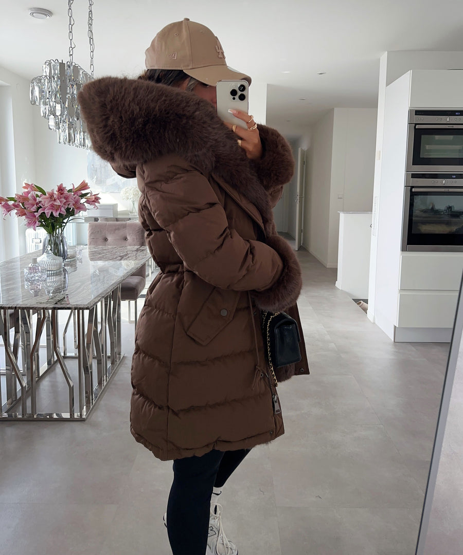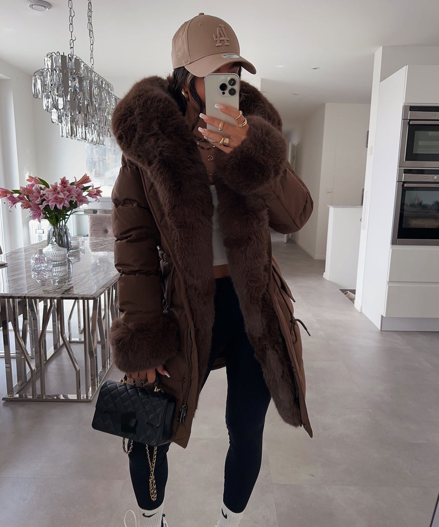Lujosa chaqueta acolchada con capucha de piel sintética