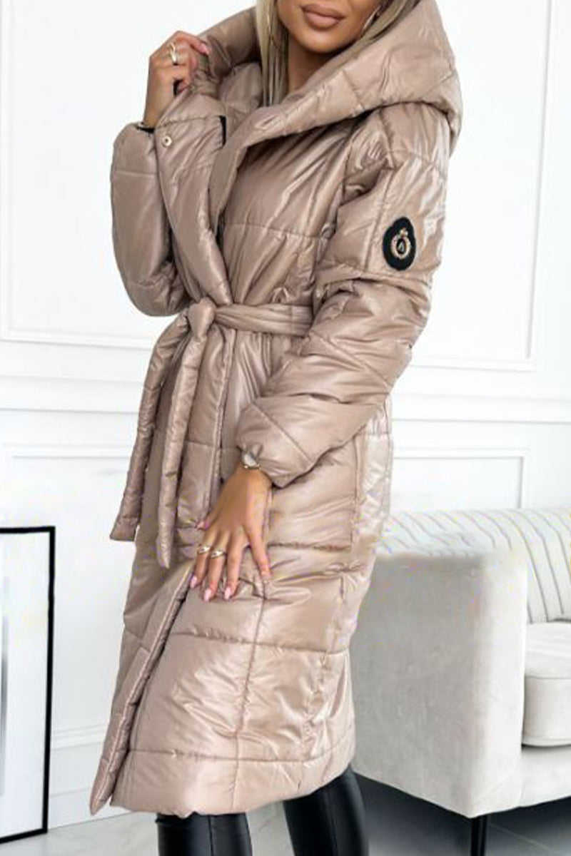Elegante abrigo de plumón de pato con cinturón en color topo